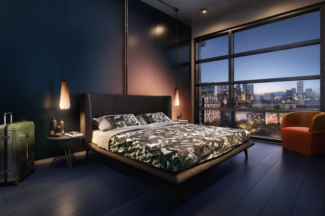 Los pilares de acero de la torre permiten que los peatones fluyan por debajo y alrededor del edificio, creando una plaza al aire libre para la libre expresión del arte y el comercio, el aire y la luz. Arriba, las vigas estructurales de neón forman un símbolo icónico que resalta la singularidad del edificio y da una idea del diseño poco convencional que se encuentra dentro.